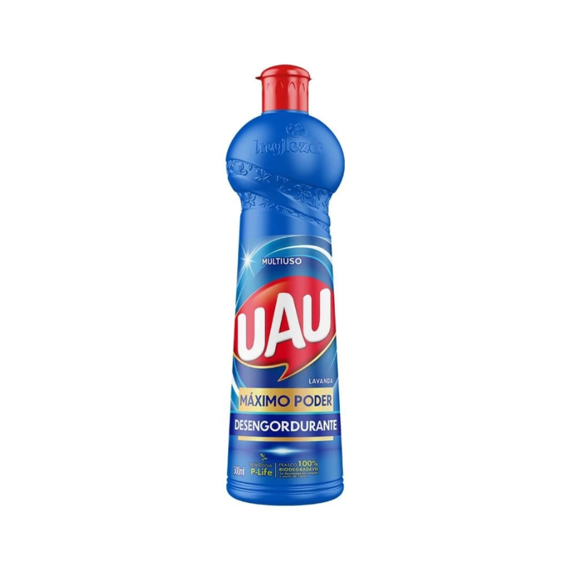 Limpador Multiuso Desengordurante UAU Lavanda 500ml. Máximo poder contra gordura com fragrância suave de lavanda.